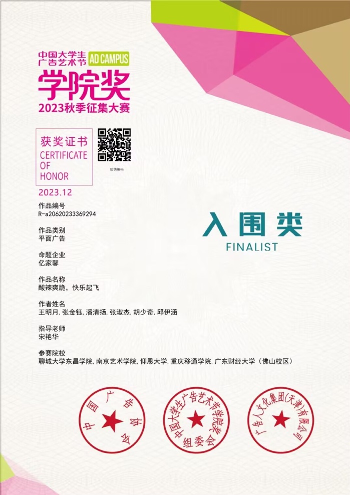 近年来,专业教师组织带领学生参加全国大学生广告艺术大赛、未来设计师NCDA大赛、米兰设计周中国高校设计学科师生优秀作品展、创研杯全国大学生英语词汇活动等各类比赛中斩获佳绩。2022-2024年获奖省级学科竞赛人数共计36人,其中“互联网+”大学生创新创业大赛获奖数3人,获省赛银奖1人,充分展示了我专业学生在创意策划、数字内容生产、跨学科竞赛及综合素质方面的全面竞争力。
